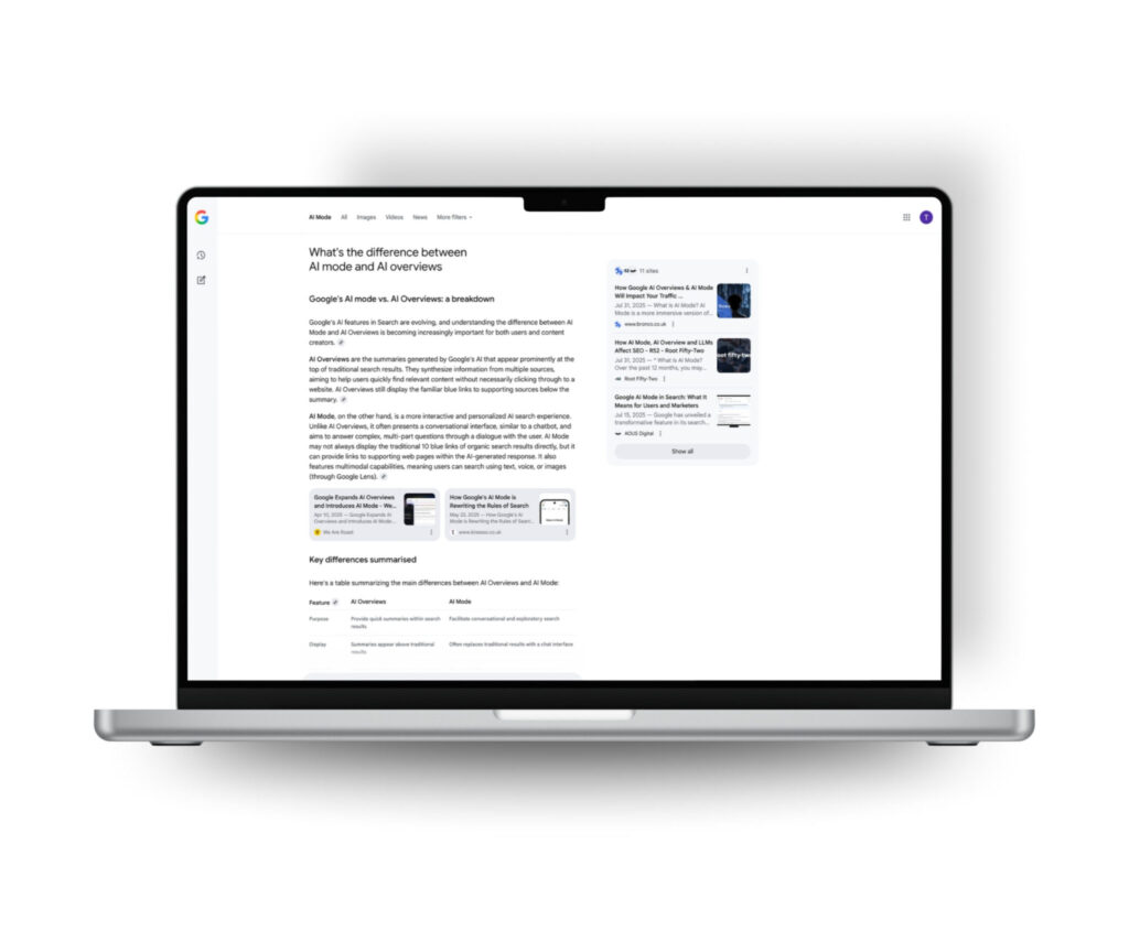 AI Mode is a separate search space for consumers to utilise. It works similarly to other AI chat tools such as Chat GPT or Perplexity. This is different from AI Overviews, which appear above the search results when conducting a Google search.